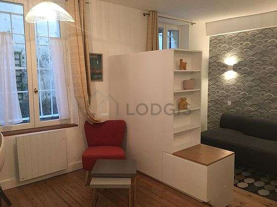 Living roomThis apartment consists of a fabulous living room with wooden floor view on courtyard. This very quiet living room is furnished and equipped for a comfortable stay: tv, linen, quilt, sofa, 1 armchair(s), coffee table, desk, wardrobe, shelves, closet, cupboard, fireplace, 1 chair(s)1 sofabed(s) of 140cm.