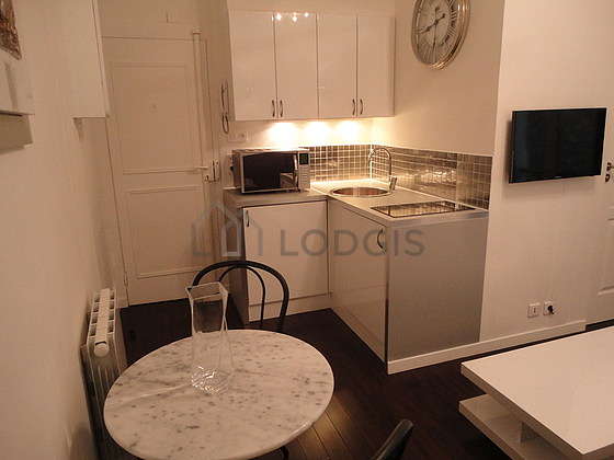 This apartment consists of great kitchen with wooden floor and all the essential equipment for your daily life: hob, refrigerator, freezer, oven, combined microwave oven, toaster, coffee-maker, cupboard, coat stand, bin.
