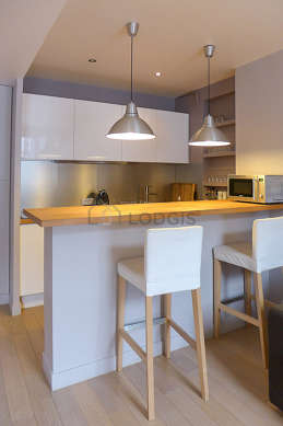 This apartment consists of beautiful kitchen with wooden floor and all the necessary equipment for your daily life: hob, refrigerator, microwave oven, toaster, dining table, storage space, cupboard, 1 chair(s).
