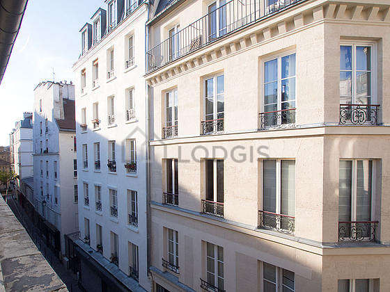 Living roomThis apartment consists of a fabulous living room with wooden floor view on road. This very quiet living room is furnished and equipped for a comfortable stay: tv, sofa, dining table, shelves, exposed bricks, wooden beams, 4 chair(s).