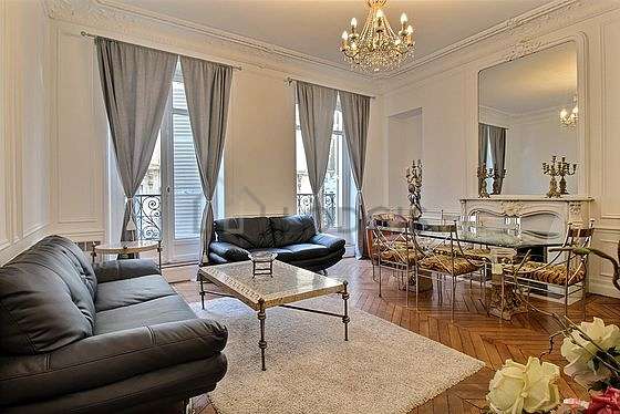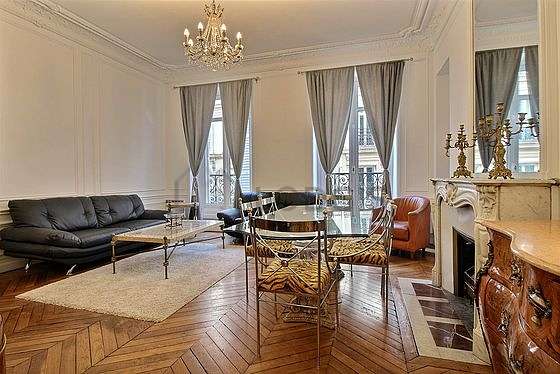 Living roomThis apartment consists of a fabulous living room with wooden floor and its windows. This very quiet living room is furnished and equipped for a comfortable stay: tv, sofa, 1 armchair(s), dining table, storage space, 1 chair(s).
