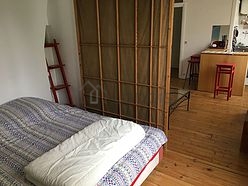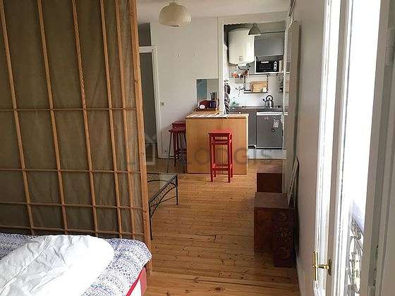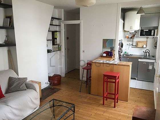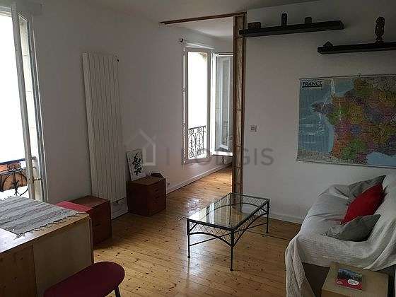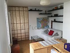 Living roomThis apartment consists of a attractive living room with wooden floor and its double-glazed windows and view on road. This quiet living room is furnished and equipped for a comfortable stay: sofa, coffee table, shelves.
