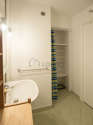 This apartment is equipped with a great bathroom. This bathroom is furnished with all the equipment you need for a comfortable stay: shelves, cupboard, bath tub, sink. The toilets are separated from the bathroom and located in an independant room.