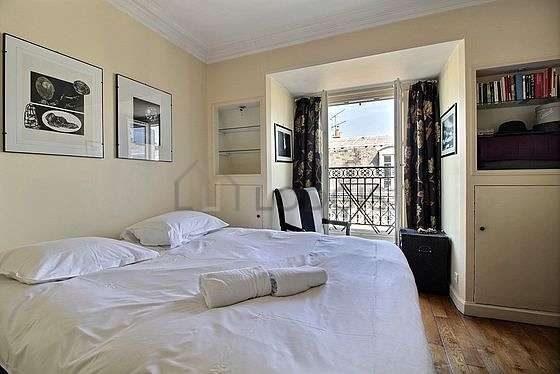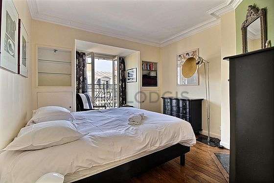 This apartment consists of a fabulous living room with wooden floor and its windows. This very quiet living room is furnished and equipped for a comfortable stay: tv, sofa, 1 armchair(s), dining table, shelves, storage space, 1 chair(s), bedside table, painting.
