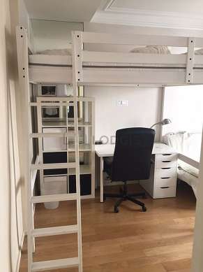 Living roomThis apartment consists of a beautiful living room with wooden floor and its double-glazed windows. This very quiet living room is furnished and equipped for a comfortable stay: quilt, refrigerator, sofa, 1 armchair(s), dining table, desk, wardrobe, shelves, crockery, 1 chair(s), mirror, bin1 loft bed(s) of 140cm, 1 sofabed(s) of 160cm.