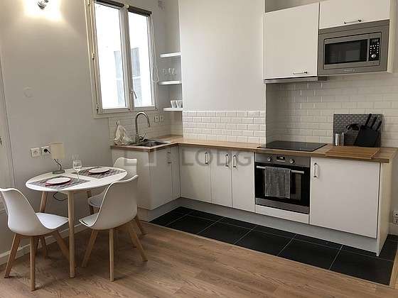 Living roomThis apartment consists of a wonderful living room with wooden floor and its double-glazed windows and view on courtyard. This quiet living room is furnished and equipped for a comfortable stay: sofa, dining table, 4 chair(s).