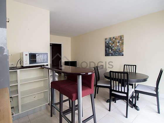 This apartment consists of a pleasant living room with tile floor and its windows and view on courtyard. This very quiet living room is furnished and equipped for a comfortable stay: tv, tv stand.