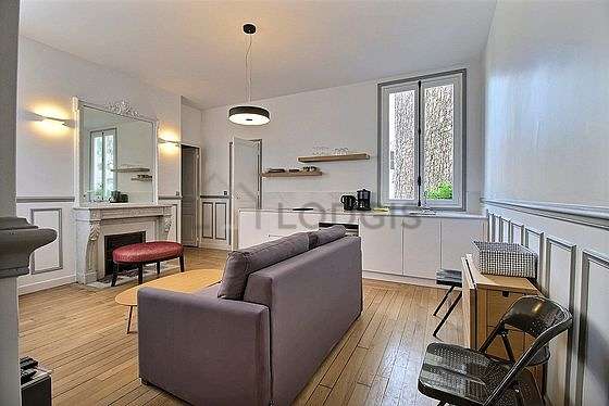 This apartment consists of a beautiful living room with wooden floor and its windows. This very quiet living room is furnished and equipped for a comfortable stay: tv, sofa, dining table, coffee table, 1 chair(s), tv stand.