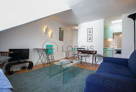 Living roomThis apartment consists of a living room with wooden floor and its windows. This living room is furnished and equipped for a comfortable stay: tv, linen, quilt, sofa, dining table, 1 chair(s)1 sofabed(s) of 90cm.