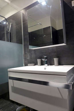 This apartment is equipped with a bathroom very bright. This bathroom is furnished with all the equipment you need for a comfortable stay: bath towels, cupboard, separate shower, sink, towel drying radiator. The toilets are located in the bathroom.