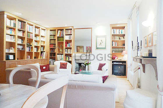 Living roomThis apartment consists of a attractive living room with wooden floor. This very quiet living room is furnished and equipped for a comfortable stay: tv, sofa, 1 armchair(s), dining table, bookcase, fireplace, 1 chair(s).