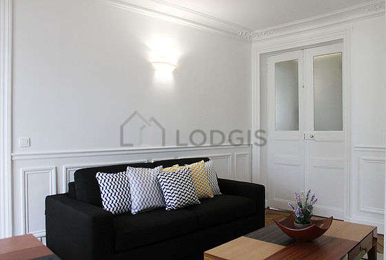 Living roomThis apartment consists of a attractive living room with wooden floor. This very quiet living room is furnished and equipped for a comfortable stay: tv, linen, quilt, refrigerator, sofa, 1 armchair(s), dining table, wardrobe, shelves, closet, storage space, cupboard, crockery, 1 chair(s), bedside table, airer, floor lamp, mirror, coat stand, bin, carpet.