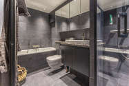 This apartment is equipped with a bathroom. This bathroom is furnished with all the equipment you need for a comfortable stay: bath towels, shelves, cupboard, bath tub, hair-dryer, sink, towel drying radiator. The toilets are separated from the bathroom and located in an independant room.