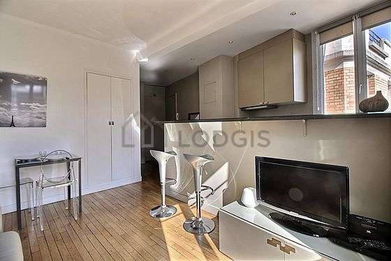 Living roomThis apartment consists of a fabulous living room with wooden floor and its windows. This very quiet living room is furnished and equipped for a comfortable stay: tv, linen, quilt, sofa, desk, shelves, cupboard, 2 chair(s)1 sofabed(s) of 140cm.