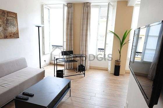 Living roomThis apartment consists of a beautiful living room with wooden floor and its double-glazed windows. This very quiet living room is furnished and equipped for a comfortable stay: tv, linen, quilt, sofa, 1 armchair(s), dining table, coffee table, desk, storage space, 5 chair(s), floor lamp, bin, painting1 sofabed(s) of 140cm.