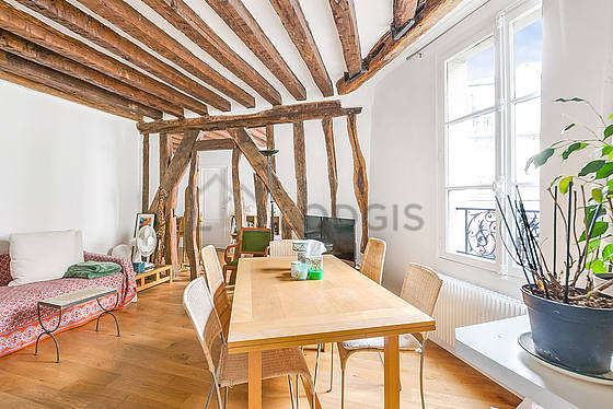 Living roomThis apartment consists of a wonderful living room with wooden floor and its windows. This very quiet living room is furnished and equipped for a comfortable stay: tv, dining table, storage space, sideboard, 4 chair(s).