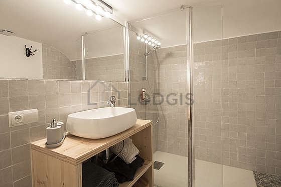 This apartment is equipped with a great bathroom. This bathroom is furnished with all the equipment you need for a comfortable stay: shelves, cupboard, separate shower, sink. The toilets are separated from the bathroom and located in an independant room.