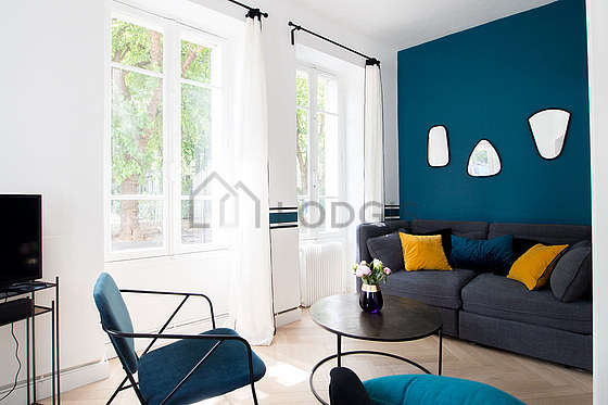 Living roomThis apartment consists of a wonderful living room with wooden floor and its windows and view on road. This very quiet living room is furnished and equipped for a comfortable stay: tv, 2 armchair(s), coffee table, tv stand, carpet1 sofabed(s) of 160cm.
