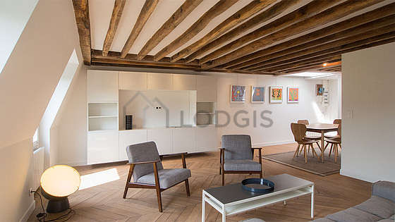 This apartment consists of a beautiful living room with wooden floor view on road. This quiet living room is furnished and equipped for a comfortable stay: tv, sofa, 1 armchair(s), coffee table, shelves, cupboard, wooden beams.