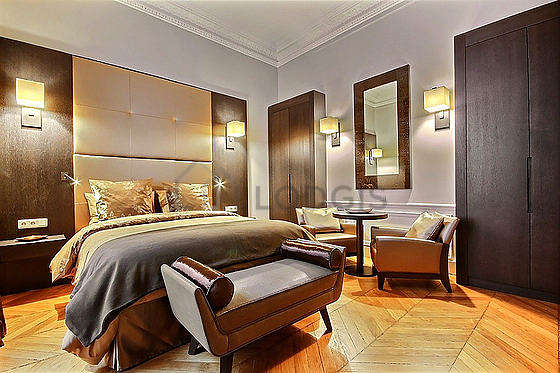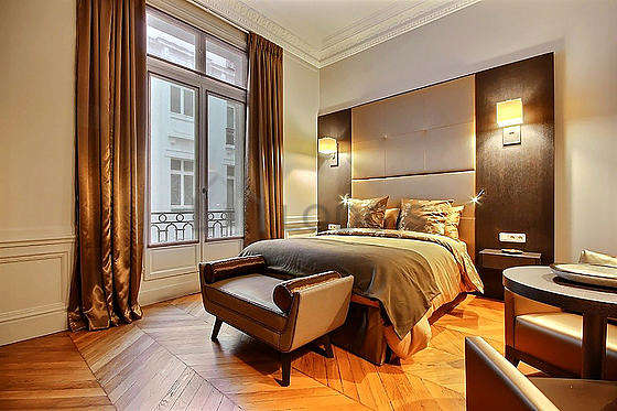 Living roomThis apartment consists of a fabulous living room with wooden floor view on courtyard. This quiet living room is furnished and equipped for a comfortable stay: tv, quilt, 1 armchair(s), dining table, wardrobe, bookcase, shelves, closet, cupboard, bedside table, tv stand, mirror, coat stand1 bed(s) of 160cm.