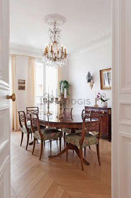 In order to share your meals in a convivial atmosphere during your stay in Paris, this duplex offers a great dining room that can welcome up to 6 guests thanks to its dining table, sideboard, crockery, fireplace, 1 chair(s).