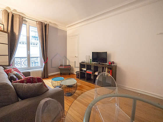 Living roomThis apartment consists of a charming living room with wooden floor view on road. This quiet living room is furnished and equipped for a comfortable stay: tv, sofa, dining table, coffee table, 1 chair(s).