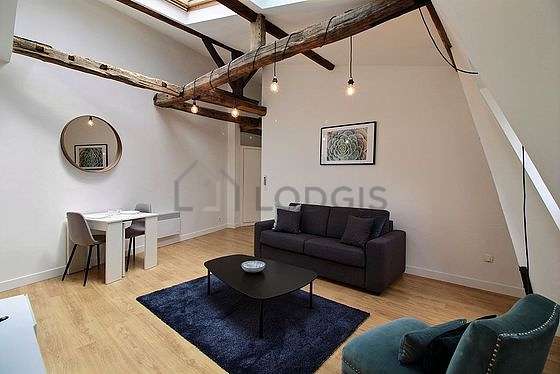 Living roomThis apartment consists of a fabulous living room with wooden floor and its windows. This very quiet living room is furnished and equipped for a comfortable stay: tv, sofa, 1 armchair(s), dining table, coffee table, shelves, storage space, cupboard, 1 chair(s).