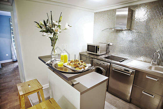 This apartment consists of kitchen with tile floor and all the essential equipment for your daily life: hob, refrigerator, freezer, microwave oven, extractor hood, toaster, kettle, coffee-maker, cupboard, crockery, stool, bar.