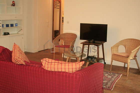 Living roomThis apartment consists of a living room with wooden floor. This living room is furnished and equipped for a comfortable stay: tv, sofa, 1 armchair(s), dining table, coffee table, bookcase, shelves, sideboard, 1 chair(s).