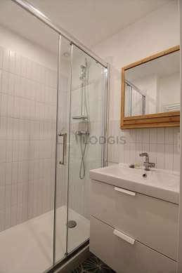 This apartment is equipped with a great bathroom. This bathroom is furnished with all the equipment you need for a comfortable stay: bath towels, shelves, cupboard, separate shower, sink. The toilets are separated from the bathroom and located in an independant room.
