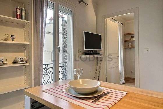 Living roomThis apartment consists of a wonderful living room with wooden floor and its windows. This very quiet living room is furnished and equipped for a comfortable stay: tv, sofa, coffee table, shelves.