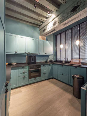 This apartment consists of great kitchen with wooden floor and all the essential equipment for your daily life: hob, refrigerator, freezer, oven, extractor hood, toaster, kettle, coffee-maker, cupboard, crockery.