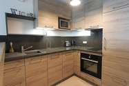 This apartment consists of great kitchen with tile floor and all the essential equipment for your daily life: hob, refrigerator, oven, microwave oven, extractor hood, toaster, kettle, shelves, cupboard, crockery, stool, bar.