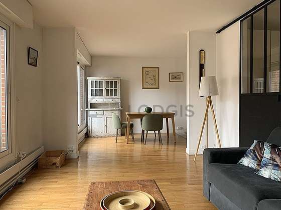 In order to share your meals in a convivial atmosphere during your stay in Paris, this apartment offers a dining room thanks to its 1 armchair(s), dining table, sideboard, crockery, 1 chair(s), floor lamp, mirror, vase.