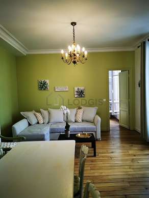 Living roomThis apartment consists of a fabulous living room with wooden floor and its windows. This very quiet living room is furnished and equipped for a comfortable stay: home cinema, tv, linen, quilt, refrigerator, sofa, 1 armchair(s), dining table, crockery, 1 chair(s), stool, airer, tv stand, mirror, coat stand, bin, painting, carpet, vase1 sofabed(s) of 160cm.