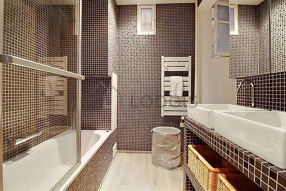 This apartment is equipped with a great bathroom. This bathroom is furnished with all the equipment you need for a comfortable stay: bath towels, shelves, cupboard, bath tub, sink, towel drying radiator. The toilets are located in the bathroom.