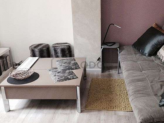 This apartment consists of a pleasant living room with wooden floor and its windows. This very quiet living room is furnished and equipped for a comfortable stay: tv, linen, quilt, sofa, 1 armchair(s), dining table, desk, wardrobe, shelves, closet, storage space, cupboard, 1 chair(s), stool, airer, tv stand, mirror, coat stand, bin, pouffe, carpet, vase1 sofabed(s) of 80cm.