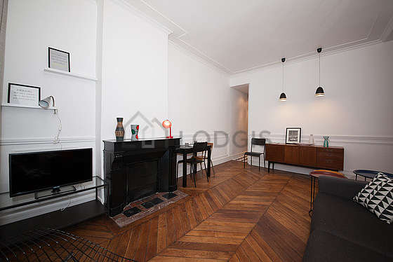 This apartment consists of a wonderful living room with wooden floor and its windows. This very quiet living room is furnished and equipped for a comfortable stay: tv, quilt, sofa, 1 armchair(s), dining table, wardrobe, shelves, closet, storage space, cupboard, crockery, 1 chair(s).