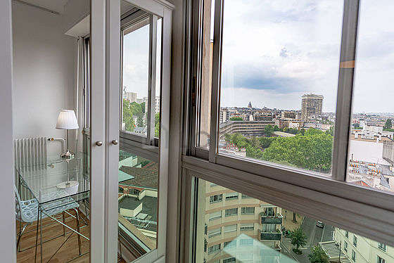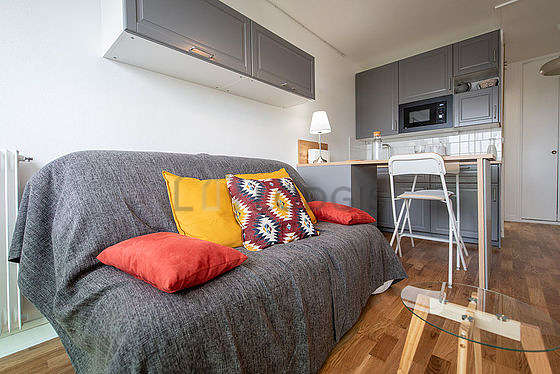 Living roomThis apartment consists of a beautiful living room with wooden floor and its double-glazed windows. This very quiet living room is furnished and equipped for a comfortable stay: sofa, coffee table, desk, closet, 1 chair(s)1 sofabed(s) of 140cm.