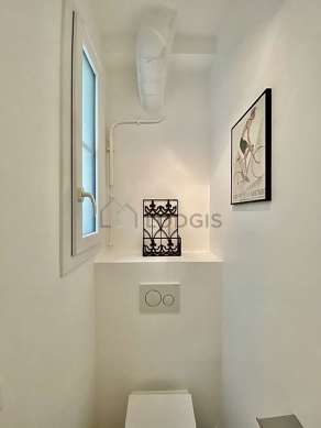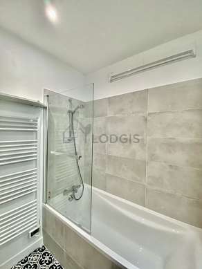This apartment is equipped with a great bathroom. This bathroom is furnished with all the equipment you need for a comfortable stay: bath towels, shelves, closet, cupboard, bath tub, hair-dryer, sink, towel rack, bin, towel drying radiator. The toilets are separated from the bathroom and located in an independant room.