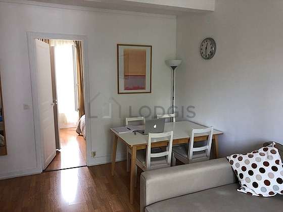 Living roomThis apartment consists of a wonderful living room with wooden floor and its windows. This very quiet living room is furnished and equipped for a comfortable stay: tv, linen, sofa, dining table, shelves, storage space, cupboard.