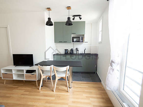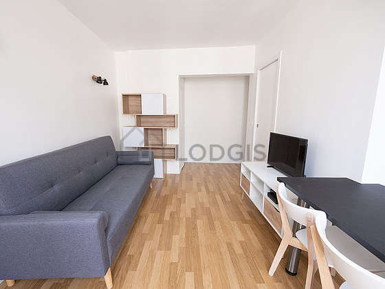 Living roomThis apartment consists of a wonderful living room with wooden floor and its windows. This very quiet living room is furnished and equipped for a comfortable stay: tv, sofa, coffee table, bookcase.