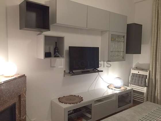 Living roomThis apartment consists of a wonderful living room with wooden floor and its double-glazed windows and view on courtyard. This very quiet living room is furnished and equipped for a comfortable stay: tv, linen, quilt, sofa, 1 armchair(s), dining table, desk, shelves, storage space, crockery, 1 chair(s).