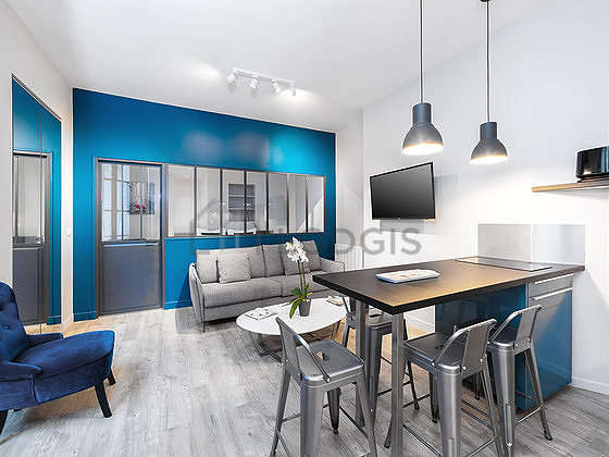 Living roomThis apartment consists of a wonderful living room with wooden floor and its windows. This very quiet living room is furnished and equipped for a comfortable stay: tv, 1 armchair(s), dining table, coffee table, 1 chair(s).
