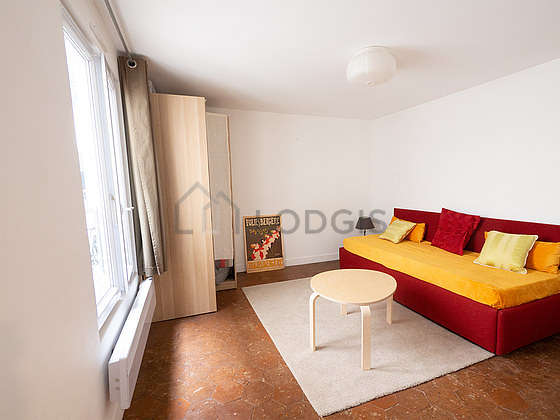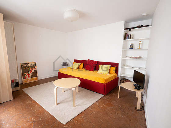 Living roomThis apartment consists of a fabulous living room with a floor tiles floor and its double-glazed windows. This very quiet living room is furnished and equipped for a comfortable stay: tv, linen, quilt, refrigerator, sofa, dining table, wardrobe, bookcase, shelves, closet, cupboard, crockery, 1 chair(s), stool, bedside table, mirror, coat stand, bin, pouffe, painting, set of tables, carpet, vase1 pullout bed(s) of 150cm.