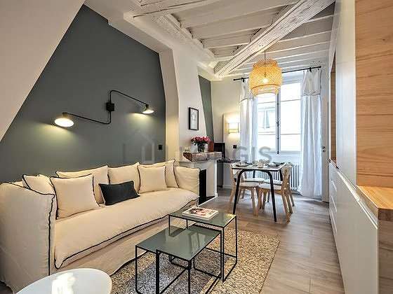 Living roomThis apartment consists of a beautiful living room with wooden floor and its windows. This very quiet living room is furnished and equipped for a comfortable stay: tv, linen, quilt, sofa, dining table, desk, wardrobe, bookcase, shelves, cupboard, fireplace, 1 chair(s), floor lamp, tv stand, coat stand, bin, pouffe, set of tables, carpet1 sofabed(s) of 160cm.