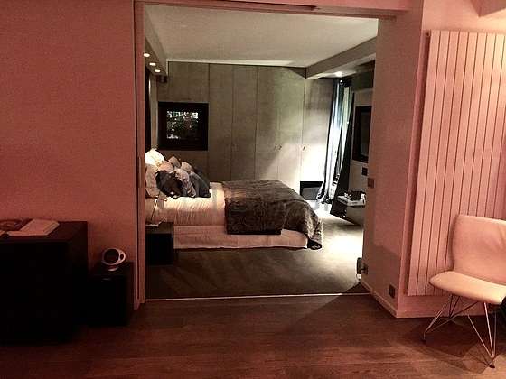 This penthouse consists of a beautiful living room with wooden floor and its windows. This very quiet living room is furnished and equipped for a comfortable stay: tv, sofa, 1 armchair(s), dining table, coffee table, shelves, closet, storage space, cupboard, crockery, 8 chair(s).
