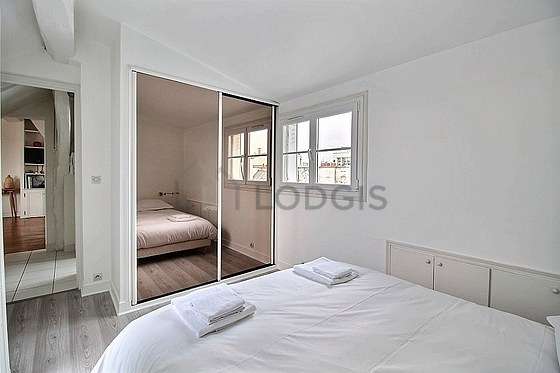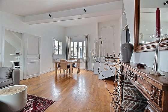 Living roomThis apartment consists of a beautiful living room with wooden floor and its windows. This very quiet living room is furnished and equipped for a comfortable stay: tv, sofa, dining table, coffee table, cupboard, 1 chair(s), mirror, painting, carpet1 sofabed(s) of 140cm.