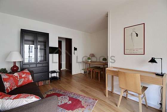 Living roomThis apartment consists of a beautiful living room with wooden floor and its windows with balcony. This very quiet living room is furnished and equipped for a comfortable stay: tv, sofa, 1 armchair(s), dining table, desk, shelves, cupboard, 1 chair(s), stool, carpet.