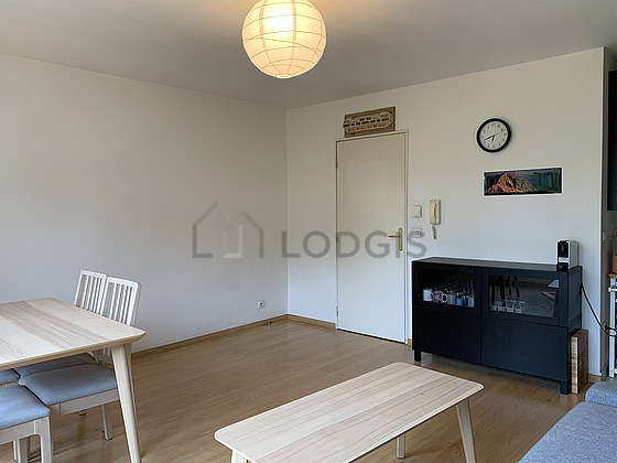 Living roomThis apartment consists of a living room with wooden floor and its windows. This living room is furnished and equipped for a comfortable stay: linen, quilt, sofa, 1 armchair(s), dining table, coffee table, storage space, cupboard, crockery, 1 chair(s).